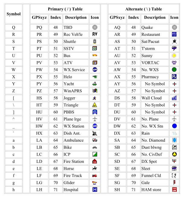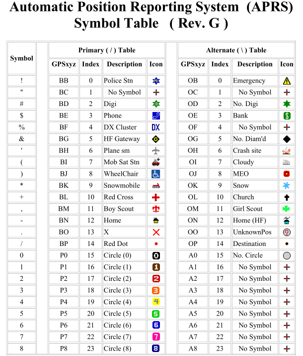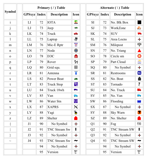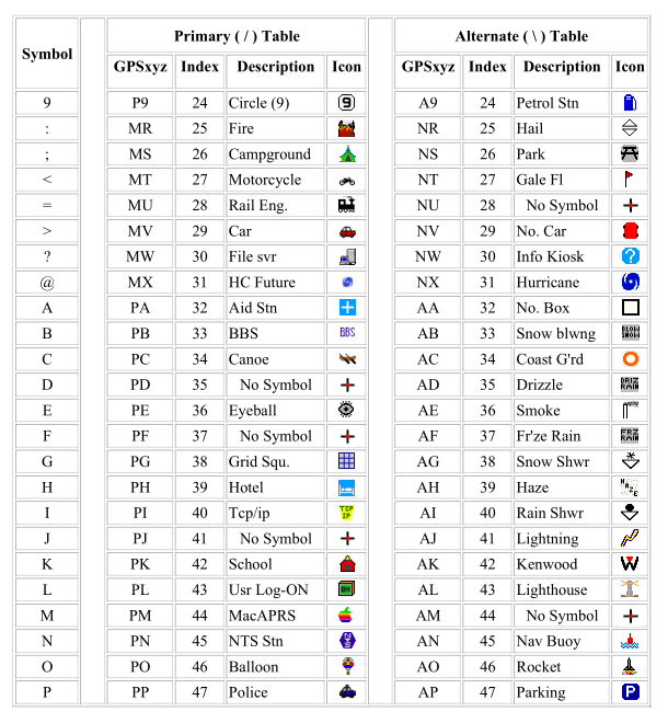 APRS图标字符对照表 日期:2023-12-24 栏目:APRS 浏览:次 用法:竖排左右图标集分别用"/"和“\”区分。使用时选择相应图标集后,再选取对应符号,比如常用的红色轿车(Car),先选取图标集“/”,再选取对应符号“>”。 一般日常使用中,“"/"”对应下的图标较为常见,不过也可以根据自己的喜好设置相应的图标集。 上一篇:AnyTone AT-D878UV 模拟APRS设置教程 下一篇:HAM大学:APRS的前世今生 内容版权声明:本站内容由网络转载收集,如有侵权请联系微信BG2UKP进行删除。 转载注明出处:http://www.chinaham.cn/APRS/123.html 相关推荐 2024-03-151SDR电台是什么? 2023-12-242树莓派+USB声卡+手台搭建APRS基站 2023-12-243中国APRS发展的若干技术问题 2023-12-194八重洲FT1D设置APRS教程 2023-12-245APRS数字中继转发规则