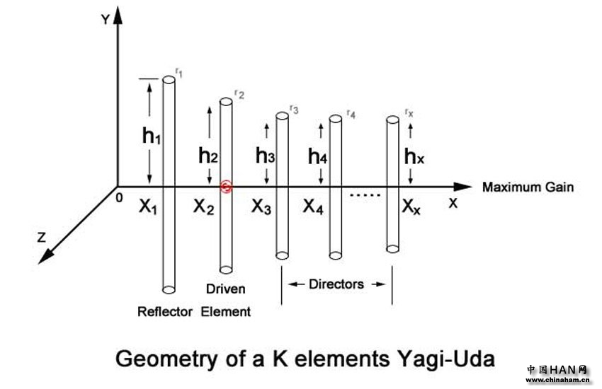 与基本半波对称振子或折叠振子天线相比,八木天线增益高、方向性强、抗干扰、距离远,且结构简单、材料易得、价格低廉、风挡面积小、轻巧牢固、架设方便。通常,八木天线由激励振荡器(也称为主振荡器)、反射振荡器(也称为反射器)和若干导向器(也称为导向器)组成。