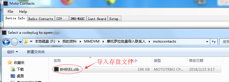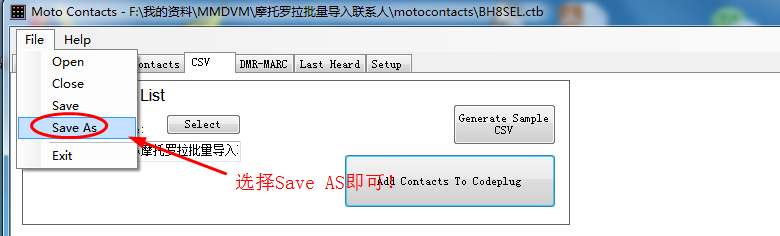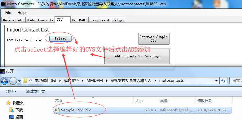 6、回到软件,依然是CVS界面,点击“select”添加上一步编辑好的CVS文档,然后点击“Add Contacts to Codeplug”添加CSV文档