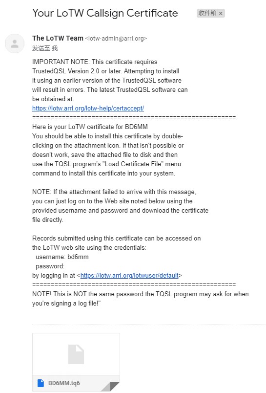 4、耐心等待,一般会在申请的当天晚上(周六、日除外)收到回执邮件,里面有您的注册信息和网站后台登陆密码,以及一个以自己呼号命名的TQ6证书附件。至此,Lotw的申请方法已经完成。