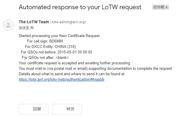 3、打开申请Lotw时的邮箱,会看到一封来自lotw-admin@arrl.org注册请求确认邮件,然后我们需要把自己的:身份证(或护照)、操作证、电台执照,这三种证件的电子版以附件的形式写写封申请邮件,发送到lotw-help@arrl.org,已经有朋友确认,写中文也可以,审批人员可以看懂中文。