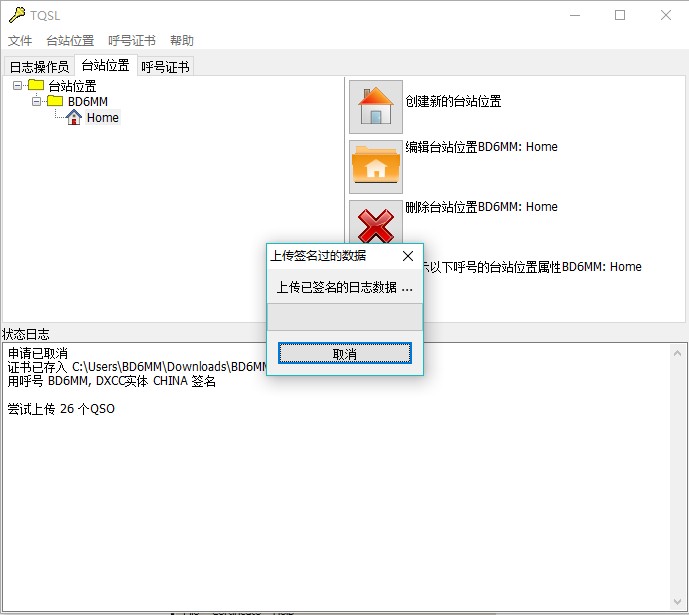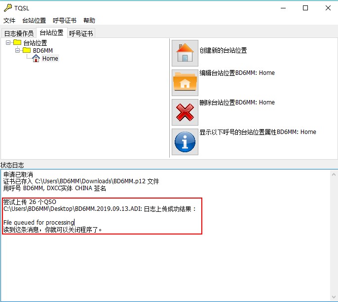 3、TQSL程序会自动对ADIF日志文件签名,并上传,在状态日志里看到“File queued for processing”时,说明上传成功,已经加入日志比对队列。