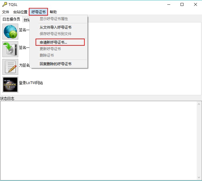 2、打开TQSL程序,菜单栏点击:呼号证书 =》申请新呼号证书。