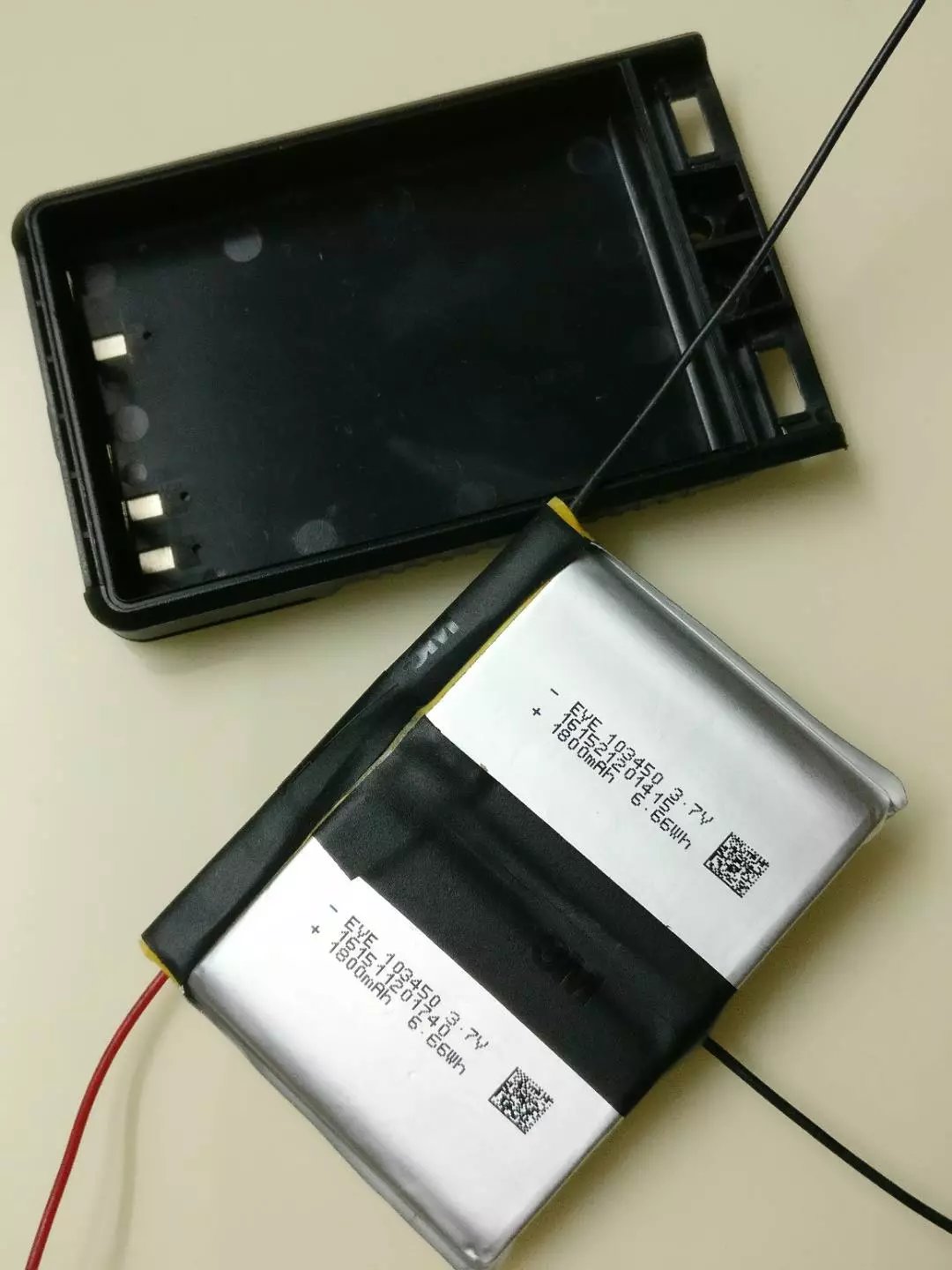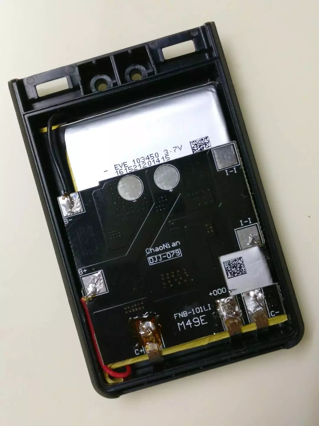 YAESU FT1D 对讲机电池组装。首先购入相关电池壳及电路套件,串联焊接2个103450电芯,装入电芯并焊接上电池保护板,然后盖上底板焊接好电池输出点,最后贴上贴纸美化一下。用万能表测量电压得7.66V,将组装好的电池插入YAESU FT1D对讲机,开机显示7.6V,搞掂!充电去……
