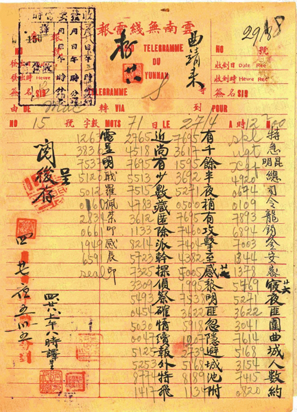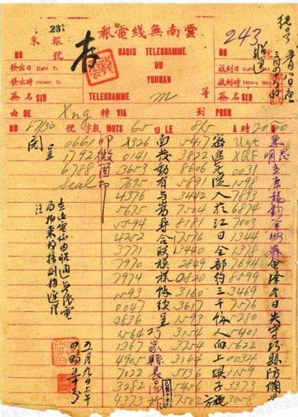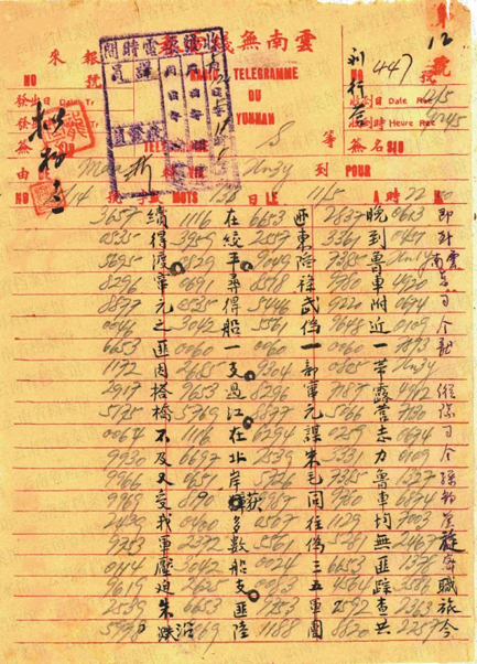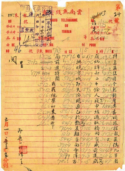 1.1935年4月26日,红一军团、五军团各一部对曲靖城进行包围监视,主力准备在沾益、曲靖、老马场地区回击滇军安恩溥旅。图为4月27日曲靖县罗佩荣发给龙云的特急电文,报告4月26日夜红军围攻曲靖。