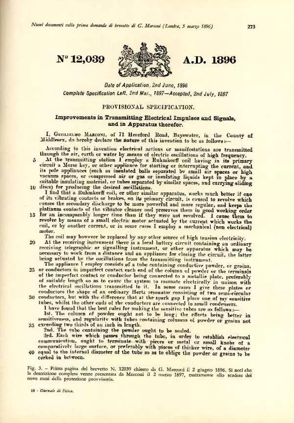 在1896年,马可尼在英国申请了自己无线电的商业专利,专利号12039。次年便成立了无线电报及讯号有限公司,后更名为马可尼公司。因为此项发明,马可尼成为1909年诺贝尔物理学奖的得主。
